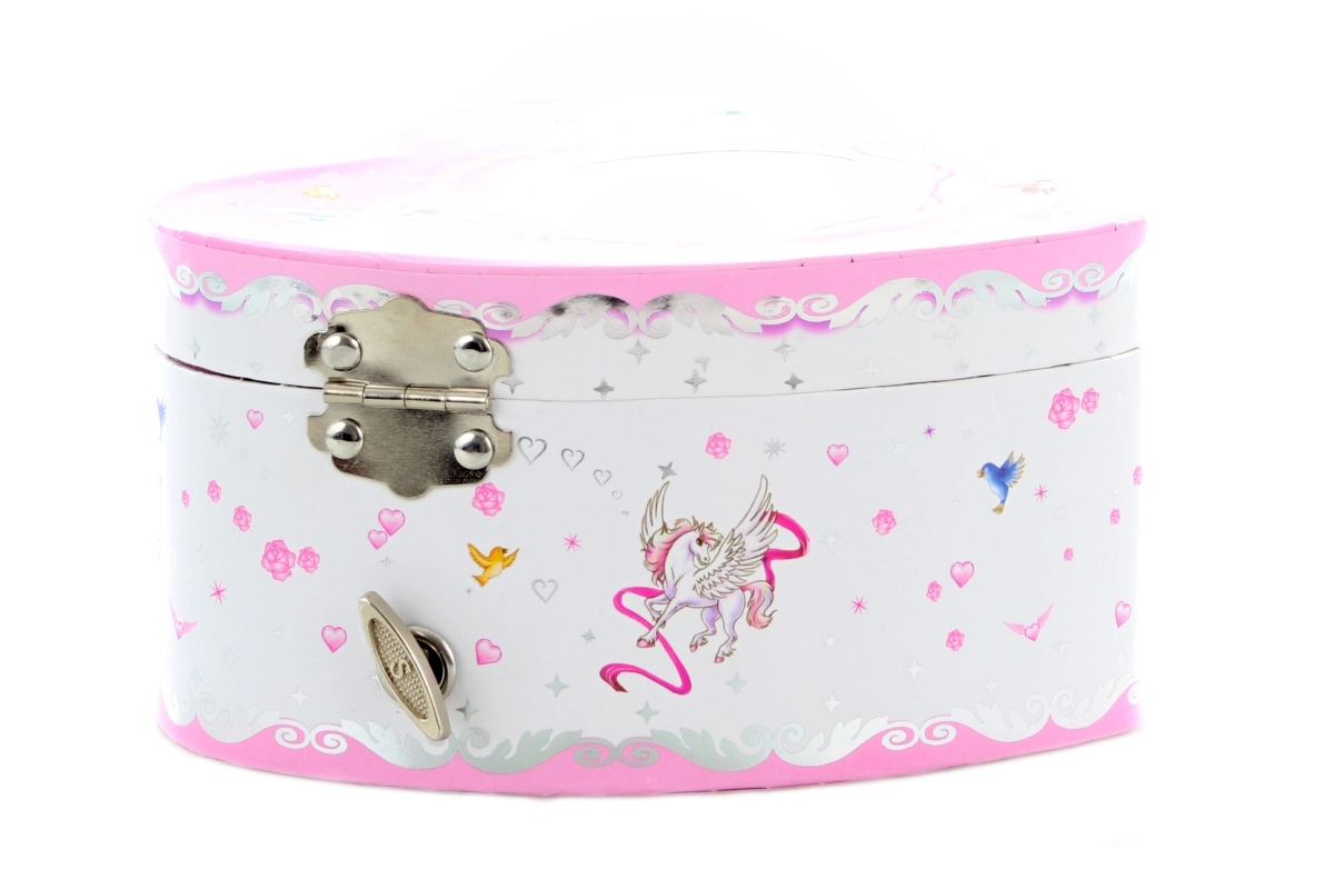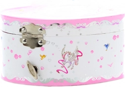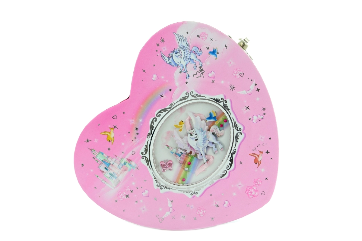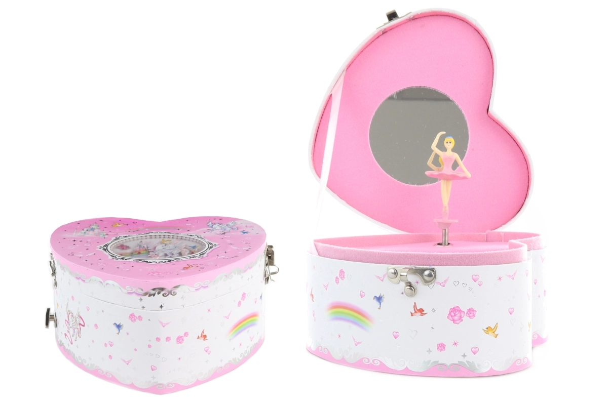 Ta čarobna glasbena škatlica za nakit v obliki srca je idealen prostor za shranjevanje prstanov, uhanov in drobnih zakladov. Po navijanju ključka v notranjosti zazveni melodija, majhna balerina pa se začne elegantno vrteti pred ogledalcem. Dizajn v rožnatih odtenkih z nežnimi motivi bo očaral tako otroke kot odrasle.