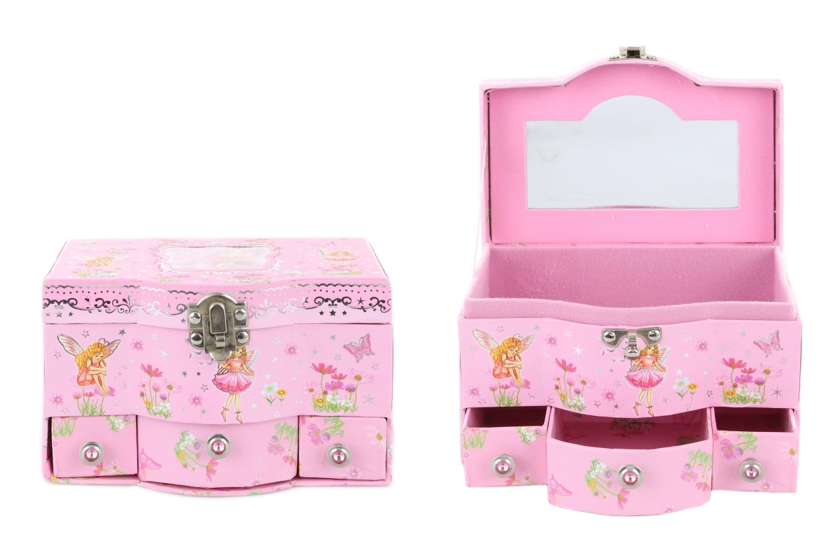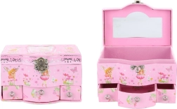 Škatla za nakit s predali. Na notranji strani pokrova je ogledalce, v spodnjem delu pa so 3 praktični predalčki. Dimenzije škatle za nakit približno 17 × 11,5 × 10 cm. Pakirano v vrečki. Starost 3+.