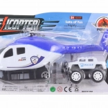 Paket vsebuje helikopter na vztrajnik velikosti približno 31 × 11 cm in avtomobilček 9,5 × 5,5 cm z prostim tekom – vse iz plastike. Velikost pakiranja: 33 × 19 cm. Starost 3+.