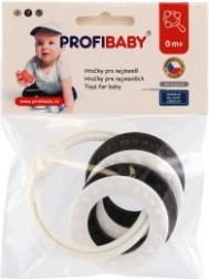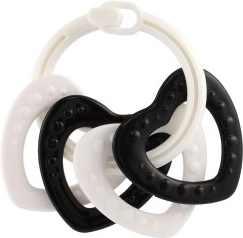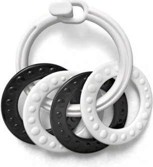 Ta komplet obročkov v črno-beli izvedbi je zasnovan za najmlajše dojenčke. Kontrastne barve pritegnejo pozornost, pomagajo uriti zbranost in podpirajo zdrav razvoj vida. Zaradi različnih oblik in površin otrok uri fino motoriko ter koordinacijo oko–roka.