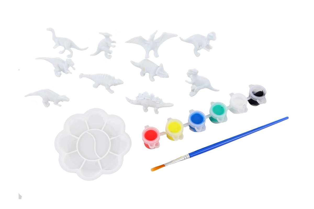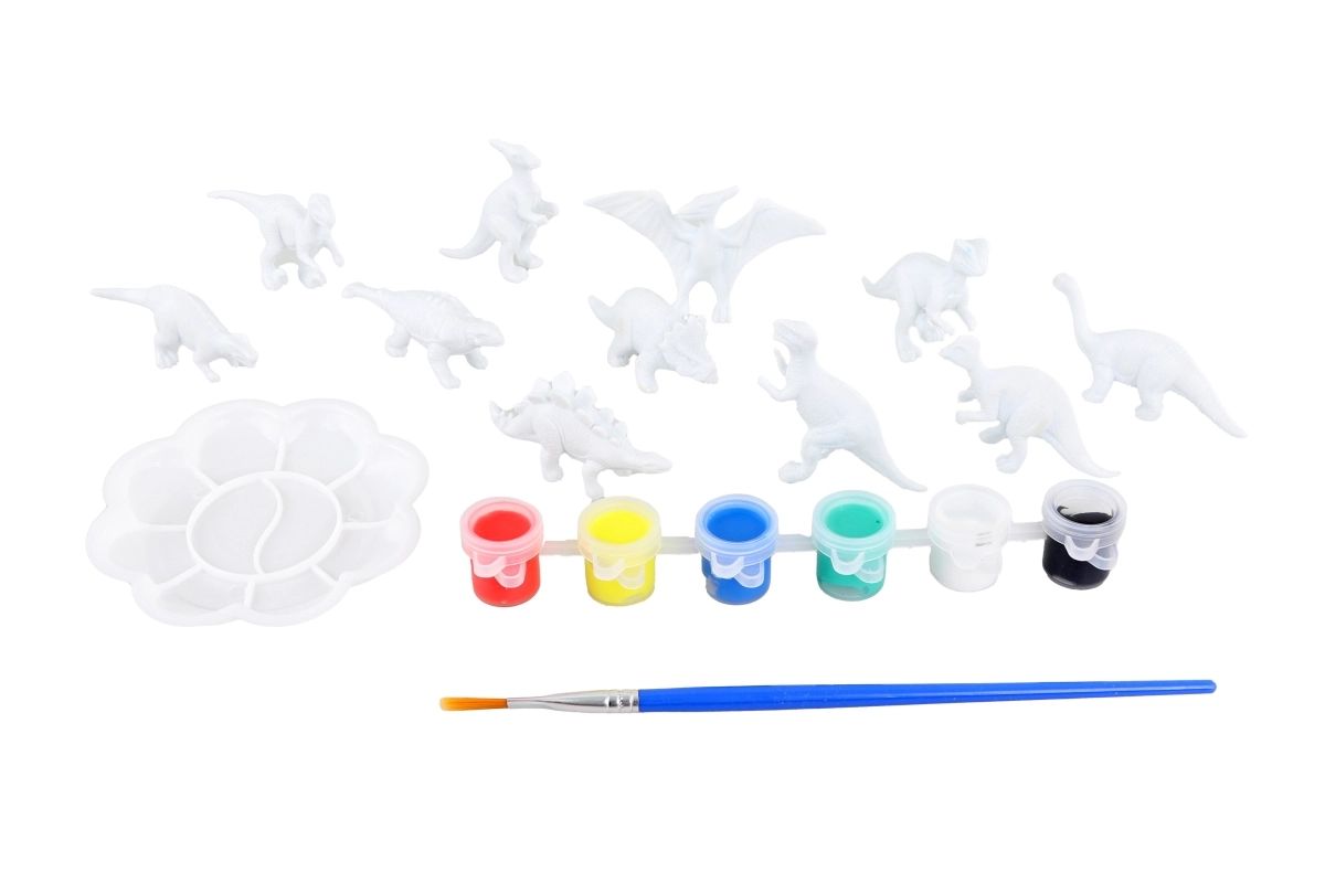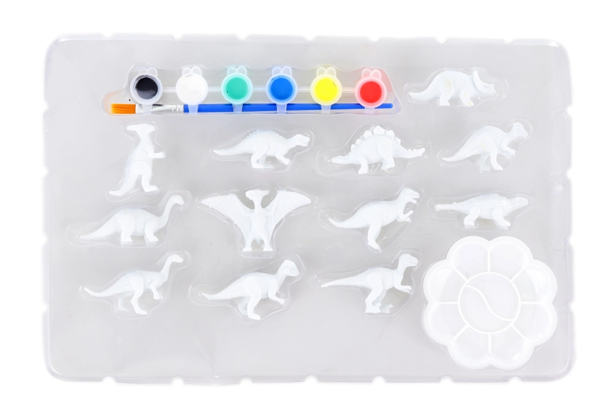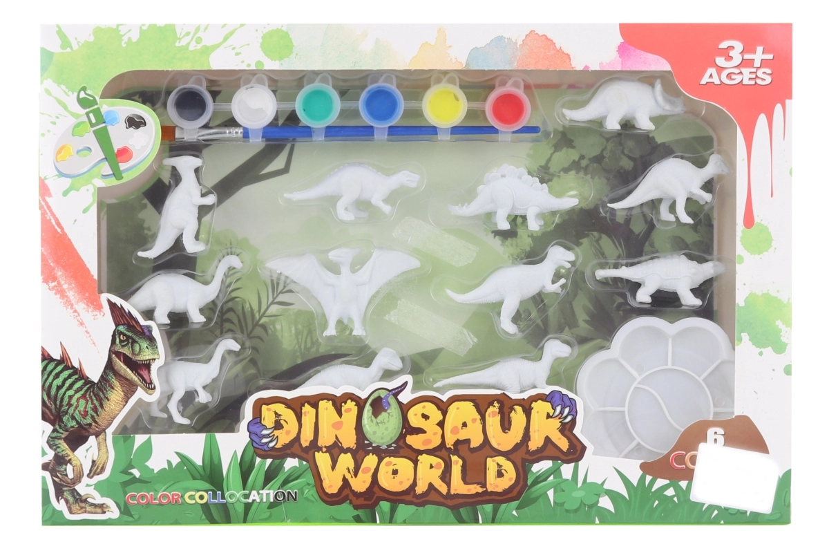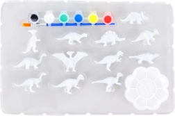Komplet vsebuje 3D dinozavre, 6 barv, čopič in paleto – otroci lahko začnejo ustvarjati takoj, brez dodatnega nakupovanja pripomočkov.
