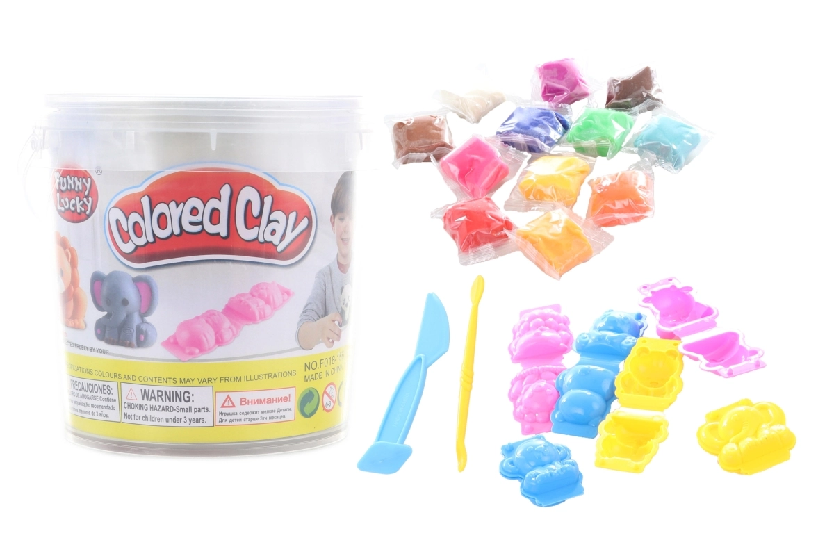 Komplet za slikanje vsebuje 12 paketkov plastelina različnih barv, 6 modelčkov in plastičen nožek. Vse je shranjeno v priročnem plastičnem vedru. Dimenzije pakiranja približno 13 × 13 × 12,5 cm. Starost 3+.
