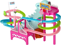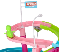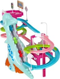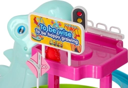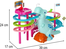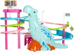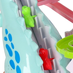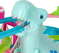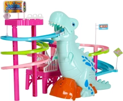 Ta barvita dirkalna steza s tematskim dinozavrom navduši mlajše in starejše otroke. Ko se avtki v obliki dinozavrov podajo na pot, veliki dinozaver oddaja realistične rjoveče zvoke, steza pa zasije z LED lučkami. Eno samo stikalo udobno upravlja gibanje in učinke, tako da se lahko otroci v celoti posvetijo igri.