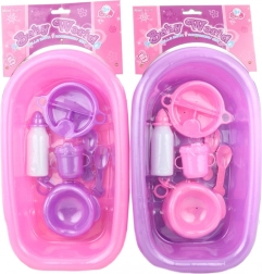 Privoščite svoji mali mamici popolno nego njene najljubše punčke s to praktično plastično kadico. Priložen je bogat nabor dodatkov – kahlica, steklenička, skodelica s pitnikom, žlička, vilica in posodica za hranjenje – vse za zabavno in realistično igro.