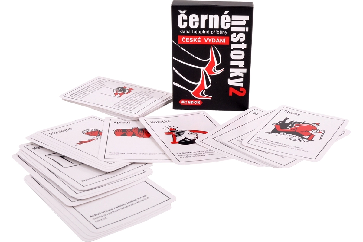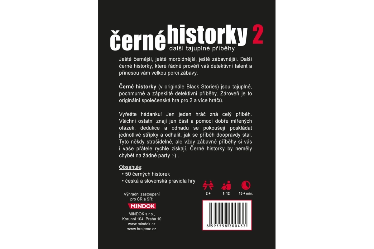 Še temnejše, še napetejše in zagotovo še zabavnejše! Črne zgodbe 2 prinašajo nov nabor ugank, ki poživijo vsako zabavo. En igralec pozna celotno zgodbo, ostali pa s pomočjo pametno zastavljenih vprašanj skušajo ugotoviti, kaj se je v resnici zgodilo.