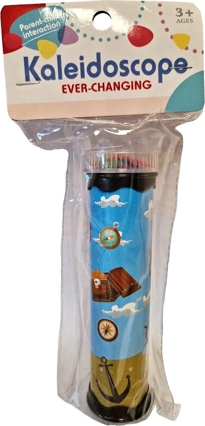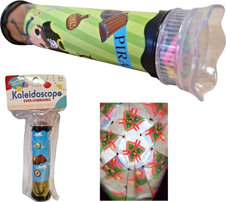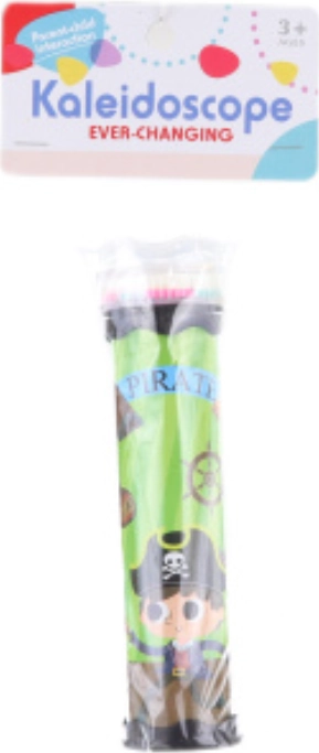 Otroški barvni kalejdoskop s podobo pirata. Dimenzije kalejdoskopa približno 17 x 5 cm. Dimenzije embalaže približno 10,5 x 24 x 5 cm. Starost 3+