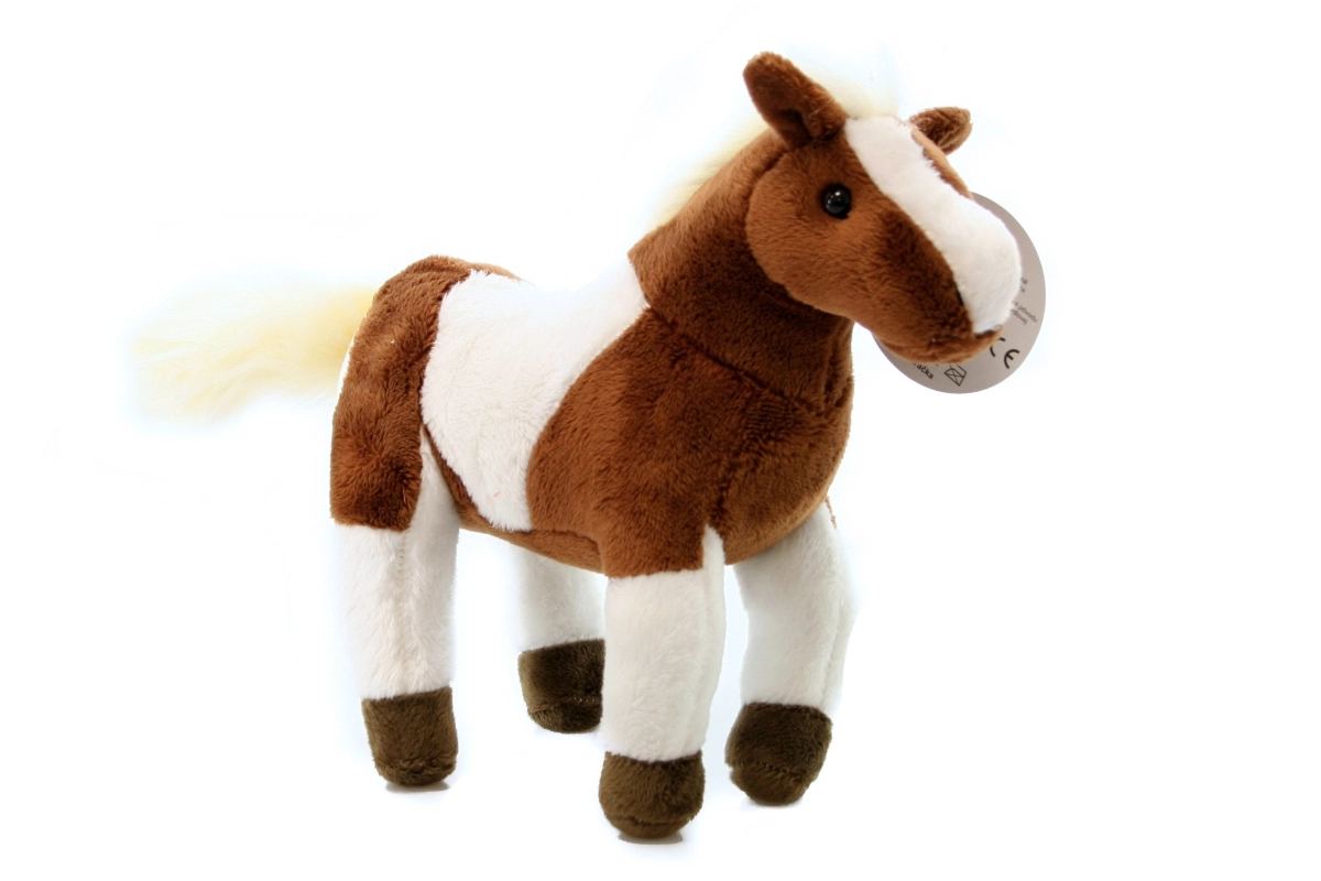 Ta rjavo-bel plišasti konjiček s pegastim vzorcem in belo grivo je popoln spremljevalec za otroke in zbiratelje plišastih igrač. Zahvaljujoč mehkem materialu je prijeten na dotik in varen za dojenčke od 0+. Stoječa izvedba igrački daje realističen videz in olajša razstavljanje na polički.