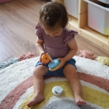 Set vključuje šest pastelno obarvanih obročkov, vključno z glavnim obročkom z medvedjo glavo, ki razvijajo vizualne in motorične spretnosti.