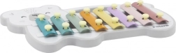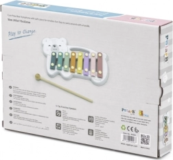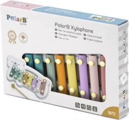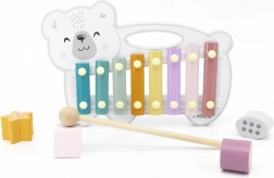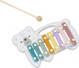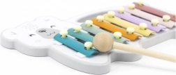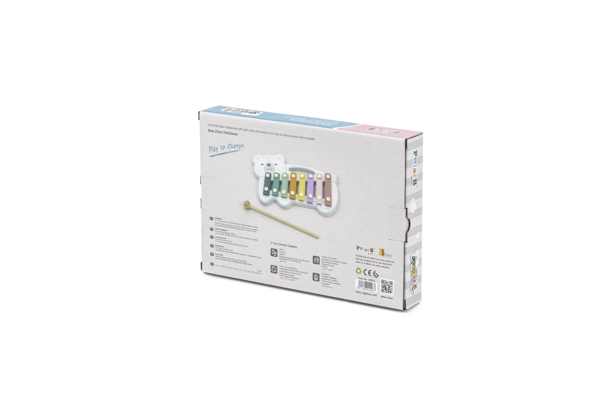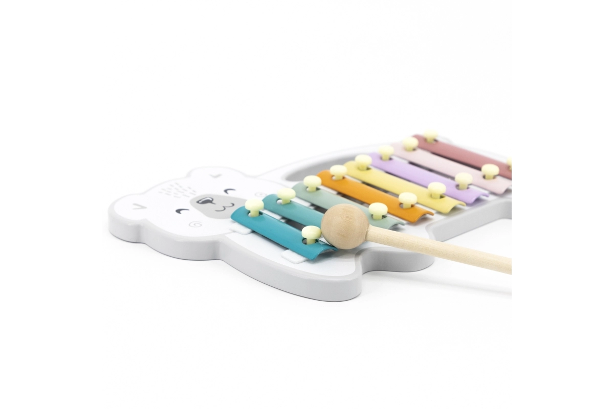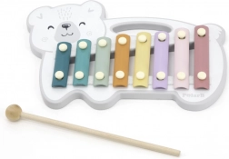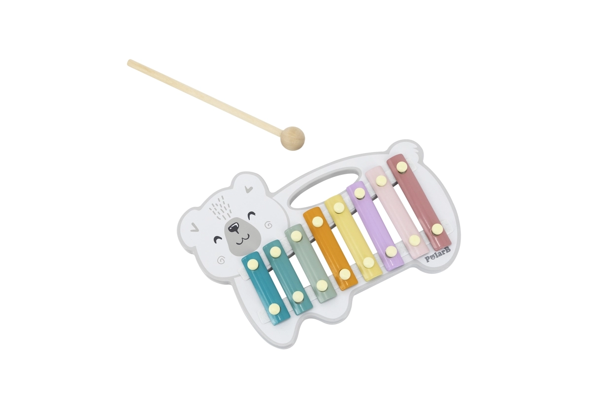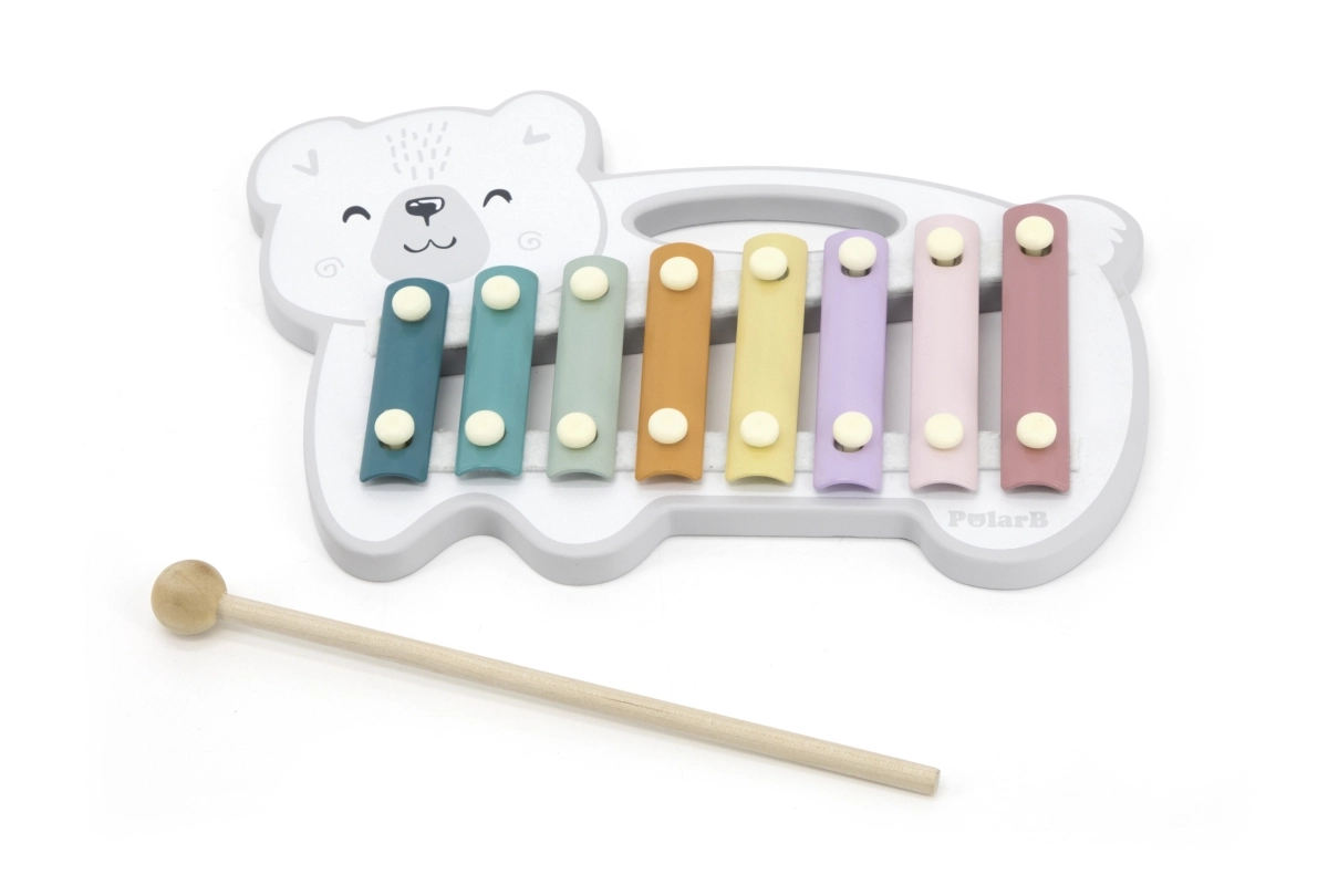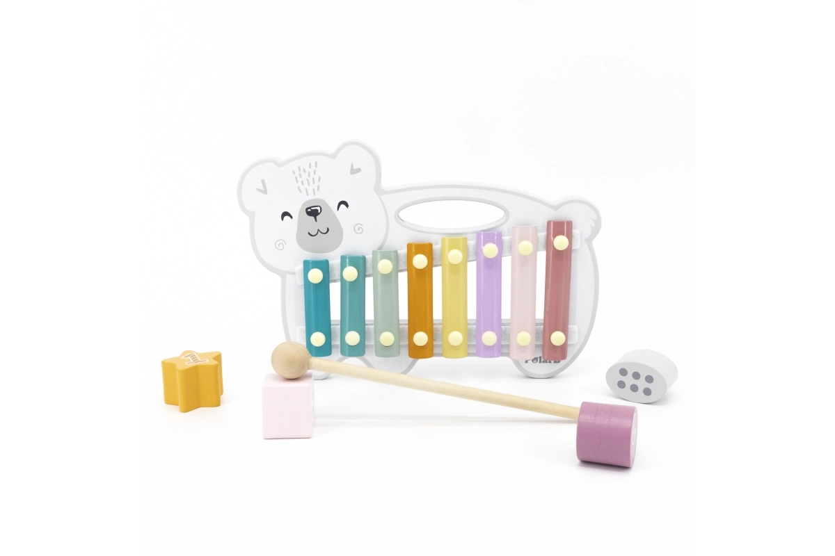 Leseni ksilofon v obliki polarnega medveda združuje igrivo estetiko z uporabnim glasbenim inštrumentom. Pastelno obarvane kovinske lamele ustvarjajo prijetne tone ob udarcu z leseno paličico, s čimer otroke naravno spodbujajo k eksperimentiranju z zvoki in ritmom.