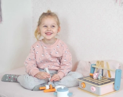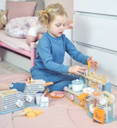 Ena igrača, dvojna mera zabave. Zložljiva zasnova omogoča preprosto menjavanje vloge kuharja in mojstra žara ter prilagoditev kompleta vsaki otroški sobi.