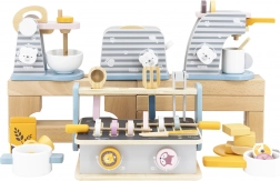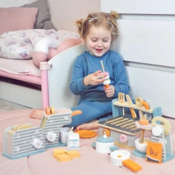 Vključeno je vse, kar potrebujete za prve recepte: dve posodi in osnovni pripomočki (nož, žlica, lopatica, klešče), palčke za ražnjiče ter lesena živila, kot so meso, jajca in zelenjava. Barvna zasnova vabi k igri in podpira vlogo malega kuharja.