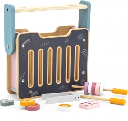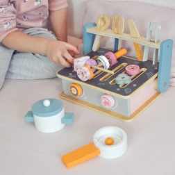 Dve posodi, nož, žlica, lopatica, klešče, palčke za ražnjiče in lesena živila (meso, jajca, zelenjava) spodbujajo domiselno igro vlog brez dodatnih nakupov.