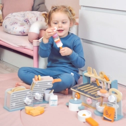 Interaktivni elementi, kot so vrtljivi regulatorji in dvojica kuhalnih plošč, poskrbijo za bolj realistično kuhanje ter otroke spodbujajo k daljši, zbrani igri.