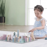 V kompletu je 56 lesenih kock različnih oblik in velikosti ter pregledna brošura z idejami za gradnjo – idealno za prve stavbe in tudi naprednejše projekte.