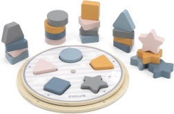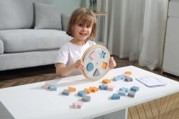 Otroci pripenjajo lesene koščke v izreze na plošči in si pri tem naravno osvajajo barve in osnovne oblike – krog, kvadrat, trikotnik ter zvezdo.