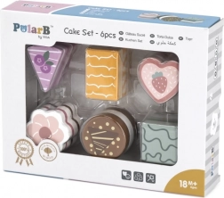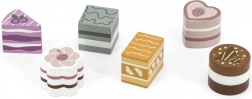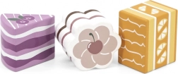 Ta set vsebuje šest lepo izdelanih lesenih priboljškov različnih oblik in barv – rezine torte, krog, srček ali prizmatični kos. Otroci se lahko igrajo slaščičarno, postrežejo medvedku ali pripravijo čajanko. Vsak kos dobro sede v otroško roko in vabi k ponavljajoči se igri.