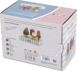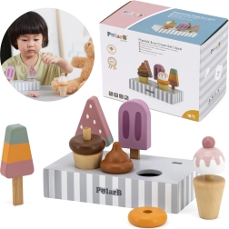 Set 5 lesenih sladoledov v privlačnih barvah prinaša otrokom neomejeno mero zabave. Sladoledi so postavljeni na stabilnem lesenem stojalu, ki služi tako za razstavljanje kot za pregledno shranjevanje. Vse je izdelano iz kakovostnega lesa in barvano z varnimi, netoksičnimi barvami.