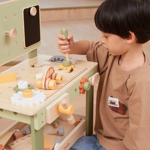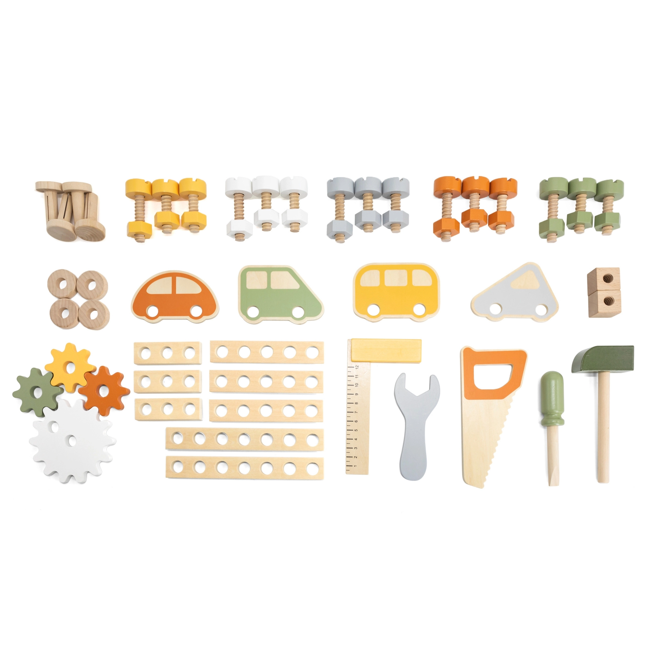 V kompletu je set orodja (kladivce, ključ, izvijač), vijaki, matice, zobniki, panel z učno uro in priročna polička za odlaganje. Otroci lahko sestavljajo lastne stvaritve, »popravljajo« in razvrščajo dele – idealno za razvoj ustvarjalnosti, potrpežljivosti in načrtovanja.