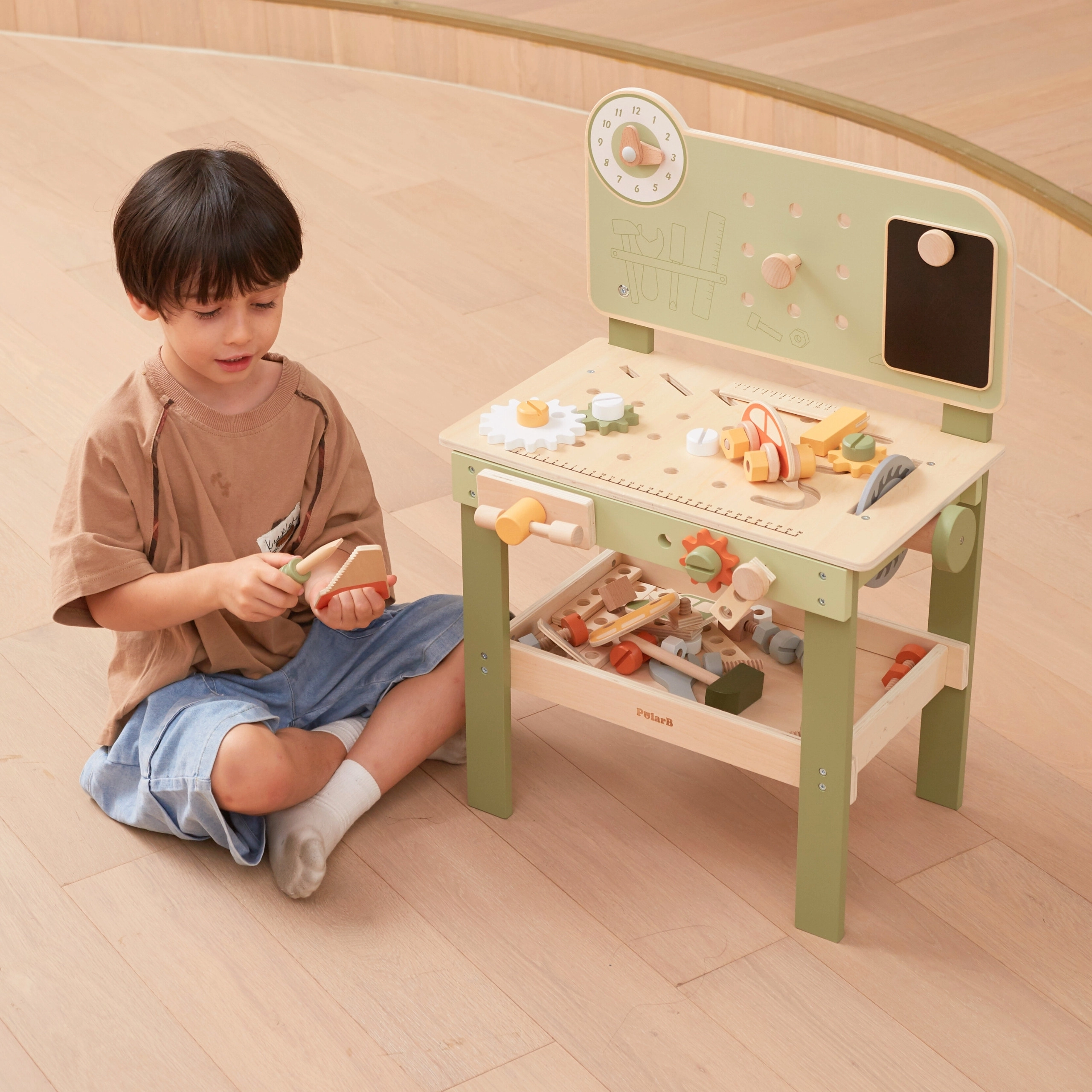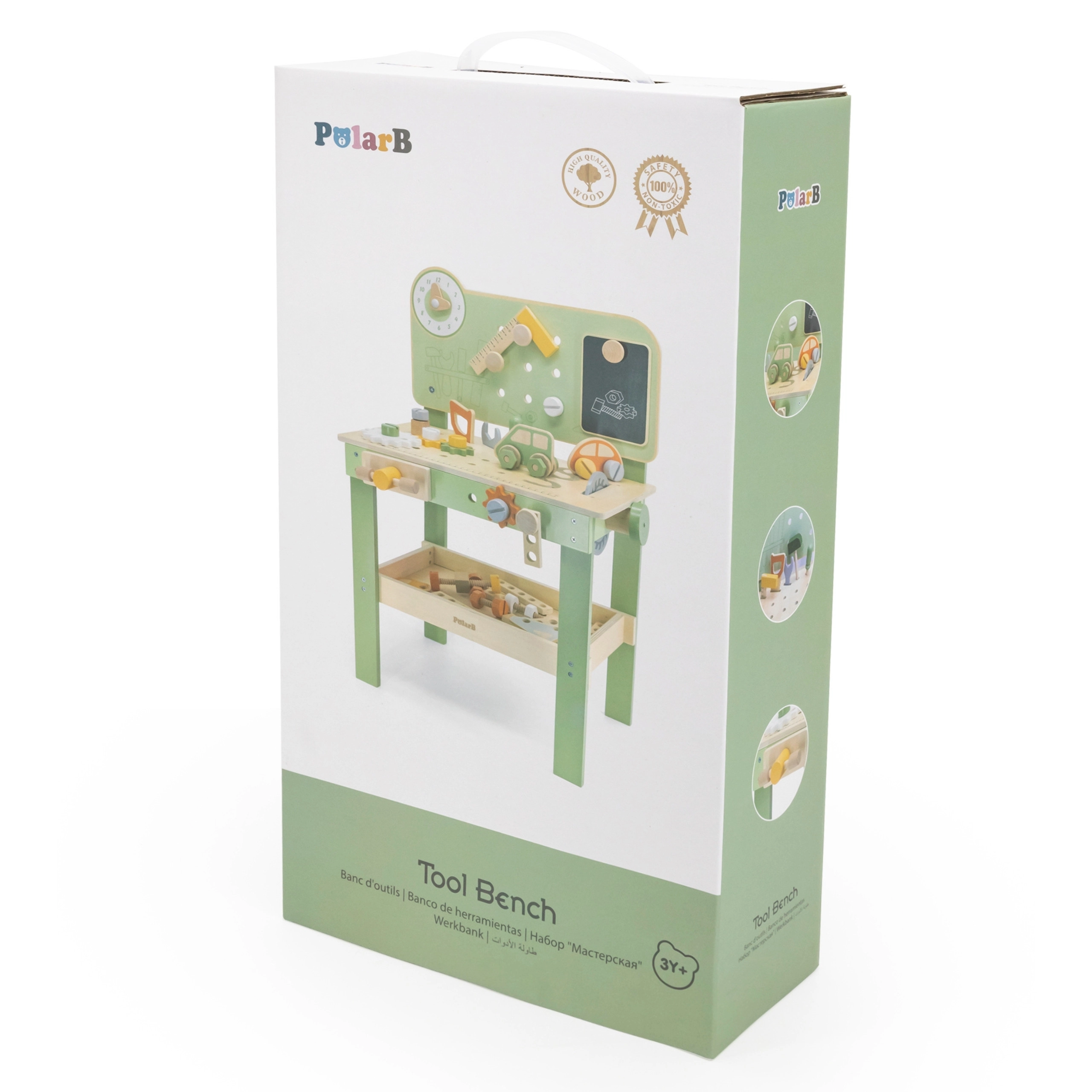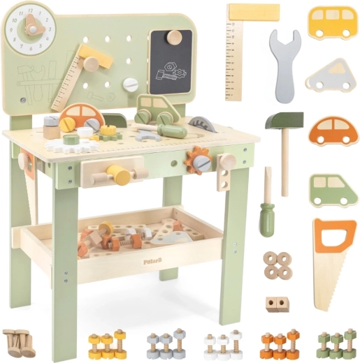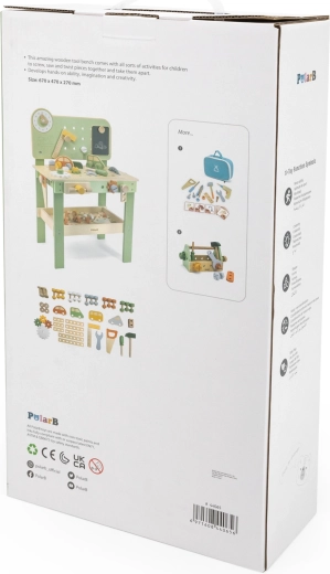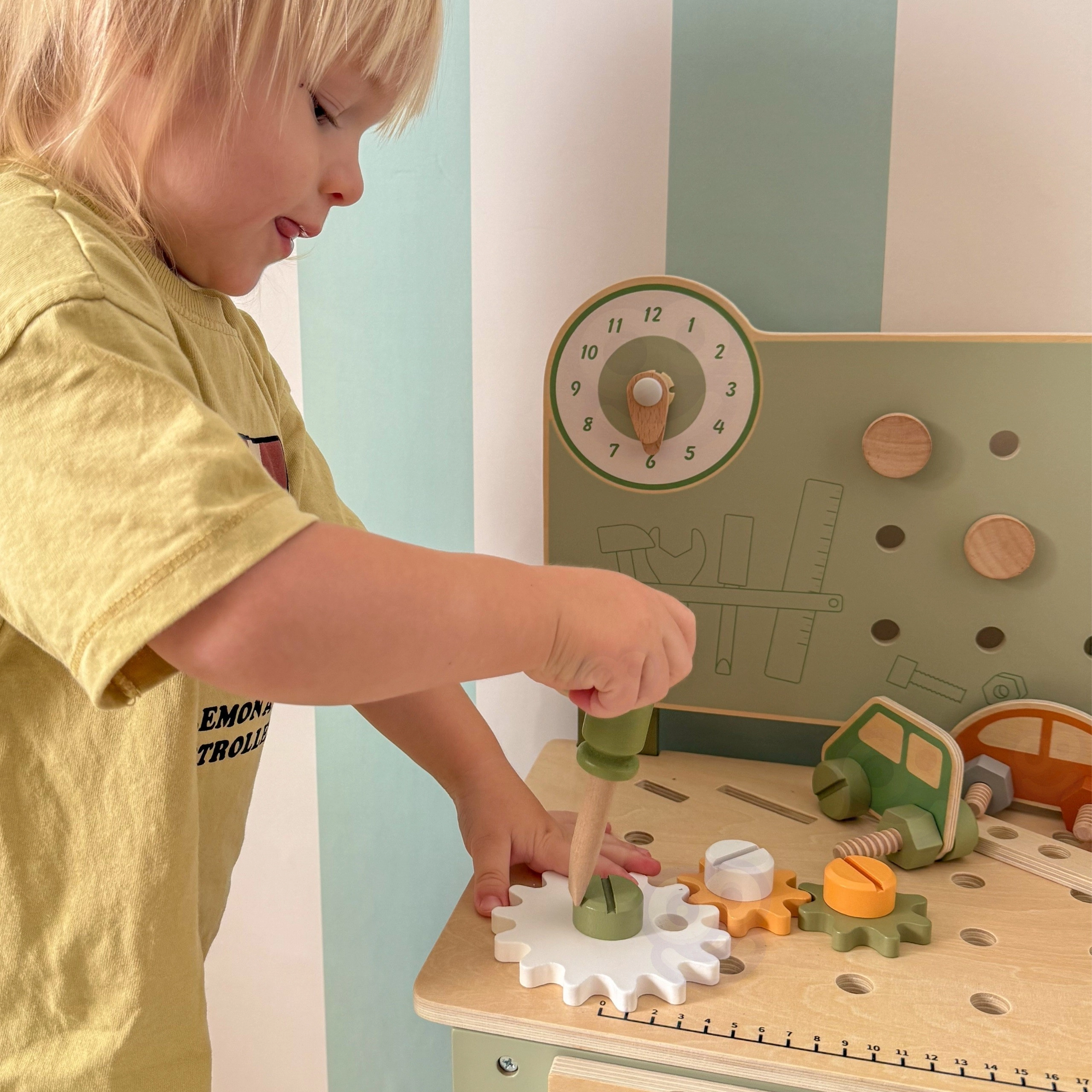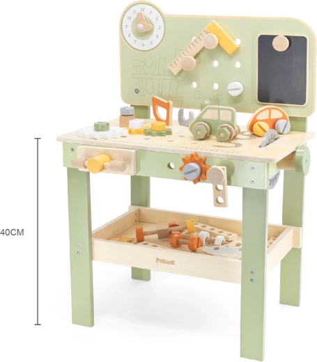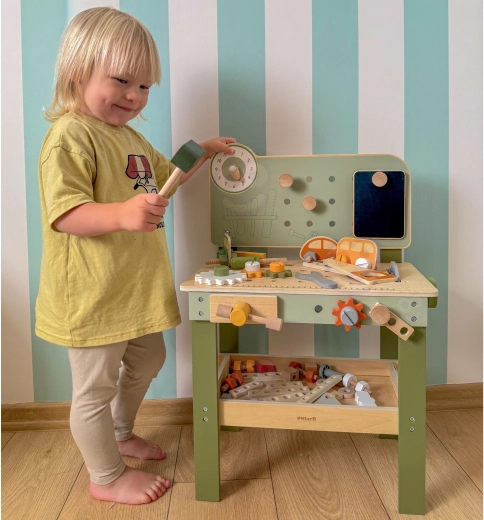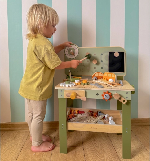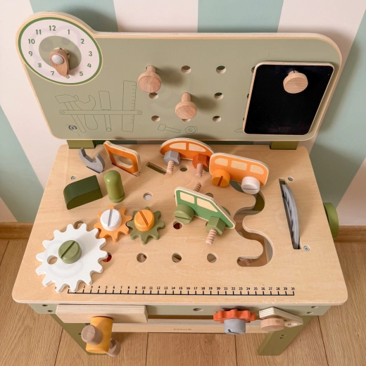 Pult s pegboardom, mersko lestvico in vrtljivimi elementi spodbuja realistično igro ter razvoj spretnosti pri delu z orodjem.