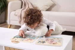 Ilustracije na podlagi nakazujejo pravilno umestitev koščkov. Otroci naravno vadijo prepoznavanje oblik, barv in živali.