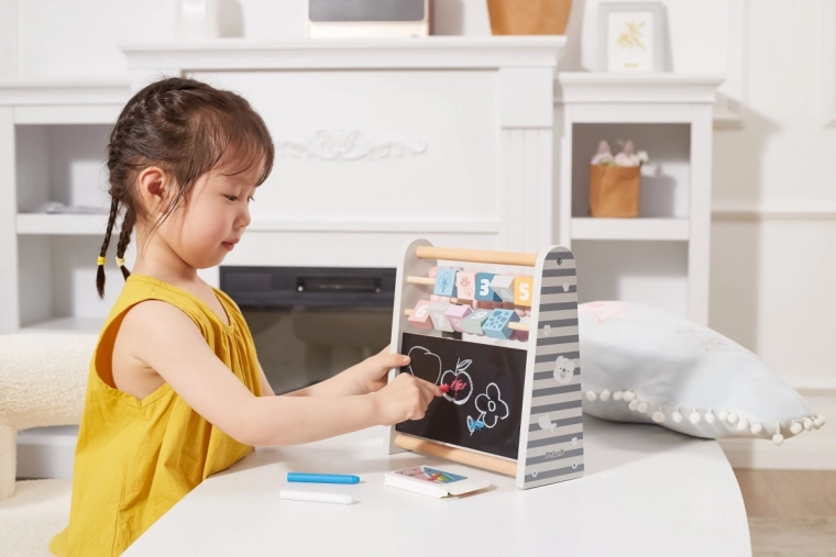Vključena je majhna tabla in brezprašna kreda za pisanje številk, prvih računskih primerov in lastnih risbic – idealno za razvoj ustvarjalnosti.