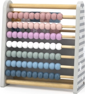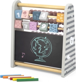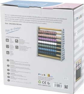 To večnamensko leseno računalo 3 v 1 združuje učenje in igro v eno celoto. Otroci si s pomočjo barvnih kroglic urijo štetje, s preklopnimi kockami s številkami se naučijo prepoznavati številke in preproste odnose, na tabli s kredo pa lahko pišejo ali rišejo svoje prve primere in slike.