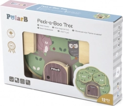 Lesena igra Peek‑a‑Boo drevo POLARB je zasnovana za igrivo raziskovanje. Otroci premikajo in vrtijo delčke, trkajo na vratca in odkrivajo ljubke prebivalce drevesa – sovico, veverico ali ježka. Ta interaktivna igra naravno razvija koordinacijo oko‑roka in spodbuja radovednost.