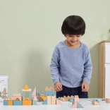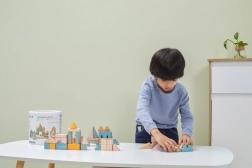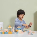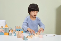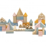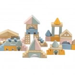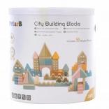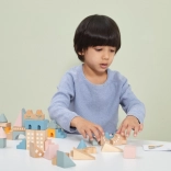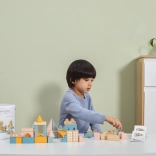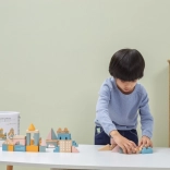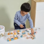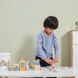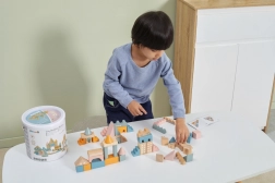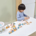 Ta kakovostna lesena sestavljanka v vedru ponuja 50 skrbno izdelanih kosov v prijetnih pastelnih barvah. Otroci lahko z njo zgradijo hišice, stolpiče in celo mesto, hkrati pa razvijajo koordinacijo, logično razmišljanje in kreativnost.