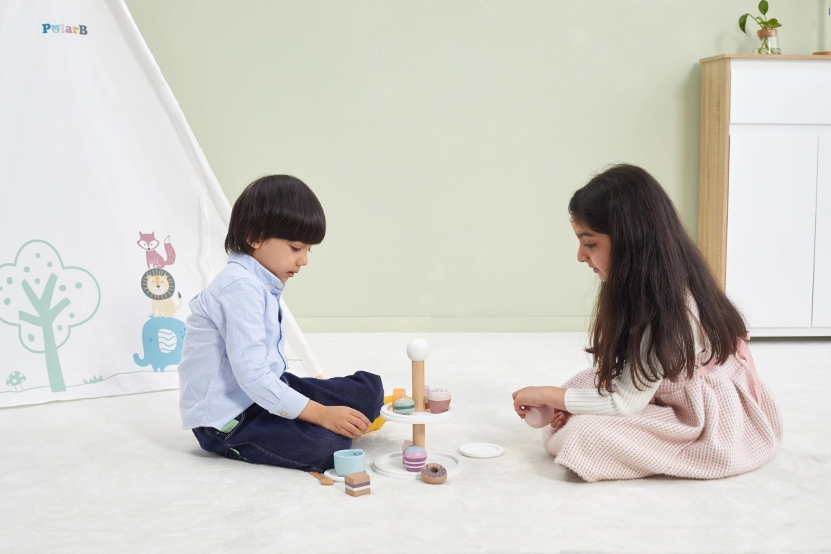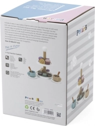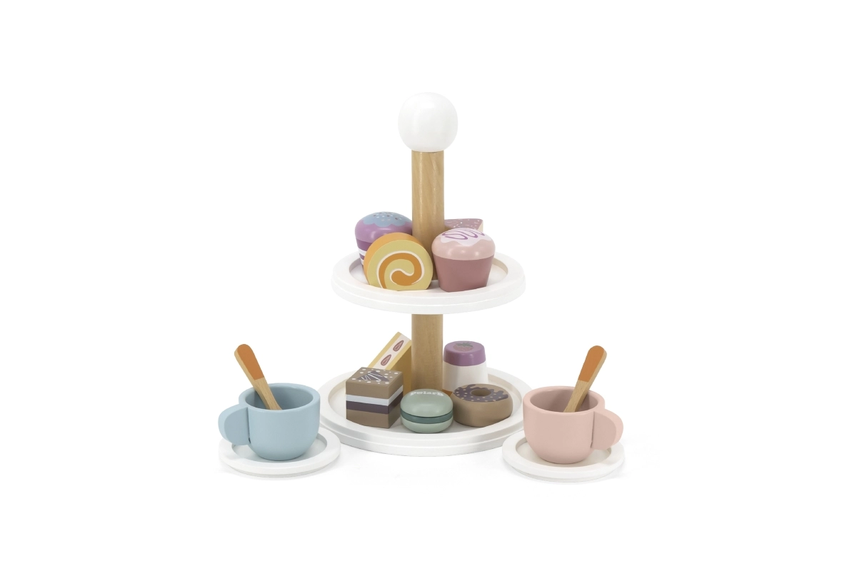 Elegantno dvonadstropno stojalo sprejme vse tortice in ustvari realistično sceno za čajni popoldan. Otroci se igrivo urijo v finej motoriki pri aranžiranju.