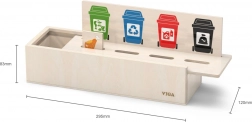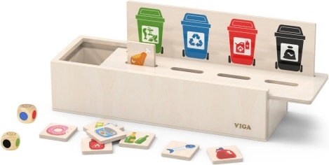Ta izobraževalna igrača VIGA je idealna za otroke, ki se učijo osnov ločevanja odpadkov. Priložena je lesena škatla z odprtinami za vstavljanje ploščic ter tabla z različnimi smetnjaki. Vključuje tudi 50 lesenih ploščic s slikami odpadkov in barvami, ki ustrezajo reciklažnim kategorijam.