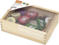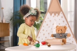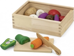 Garnitura omogoča otrokom vadbo fine motorike pri rezanju in sestavljanju zelenjave v prvotne oblike.