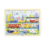 Ta kakovostna lesena sestavljanka s pisano mestno sceno in prevoznimi sredstvi bo navdušila male raziskovalce. S 48 koščki in trdnim okvirjem si otroci urijo koncentracijo, koordinacijo oko–roka in potrpežljivost. Jasne barve in razumljive ilustracije spodbujajo k ponovnemu sestavljanju.