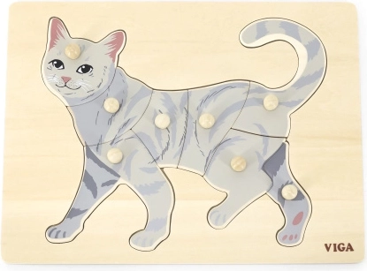 Naloga otroka je sestaviti sliko mačke ne le po ilustraciji, temveč tudi po obliki posameznih kosov. Gumbasti čepki olajšajo prijem z malimi prsti in podpirajo pravilno vodenje roke. Trdna lesena plošča drži kose zanesljivo na mestu in prenese vsakodnevno uporabo.