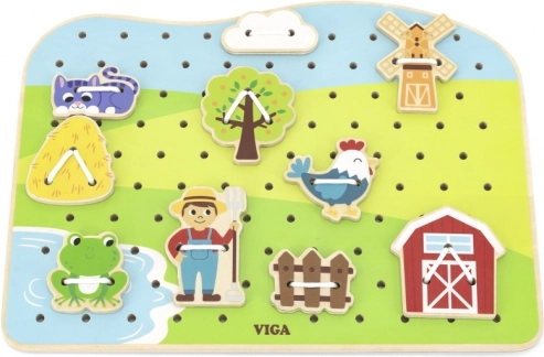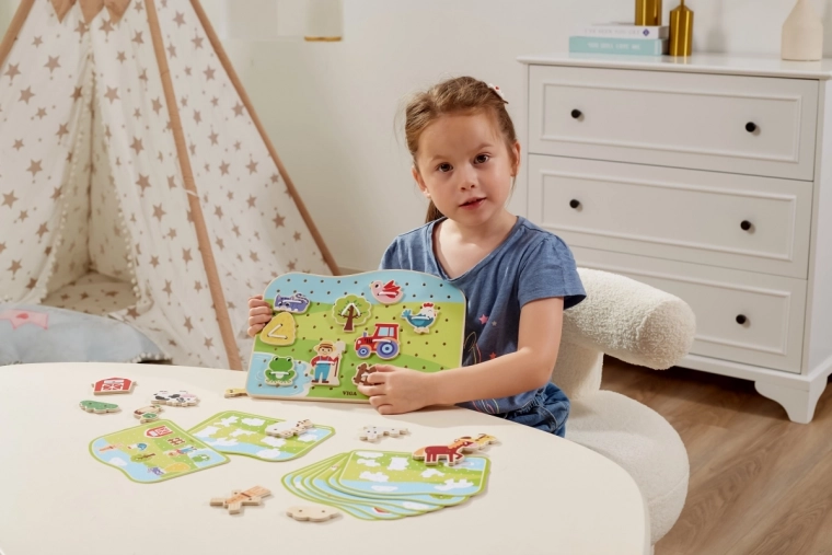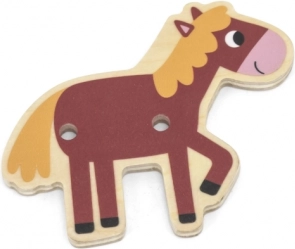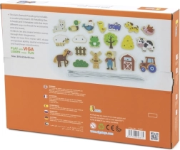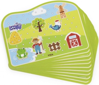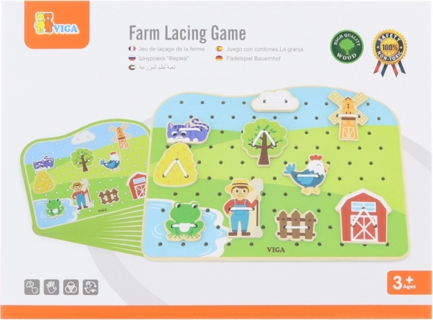 Ta prepletalni set s tematiko kmetije je idealen pripomoček za razvoj spretnosti predšolskih otrok. Otroci po predlogah ali po lastni domišljiji prepletajo vrvice skozi barvite lesene koščke, s čimer krepijo prste, izboljšujejo prijem ter se pripravljajo na pisanje in risanje.