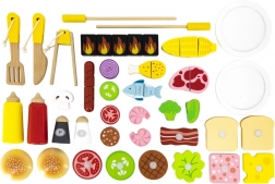 zelenjava, meso, krožniki, jedilni pribor, klešče, začimbe, oglja, nabodala, žar na kolesih