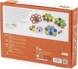 V kompletu so 4× lesena plošča pava, 36 žetonov v 6 barvah, 20 dvostranskih nalog in 2 barvni kocki. Igra podpira samostojno in skupinsko dejavnost ter odlično pripravlja na predšolsko izobraževanje.
