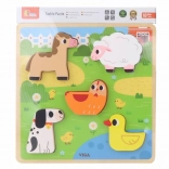 Ta ljubka lesena sestavljanka na temo kmetije vsebuje 5 robustnih koščkov – konjička, ovčko, kokoško, kužka in račko. Otroci vstavljajo živalice v ustrezne odprtine na barvni podlagi ter s tem urijo prepoznavanje oblik in vizualni spomin.