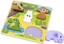 Lesena vstavljanka VIGA z gozdnimi živalmi je idealna prva sestavljanka za najmlajše. Naloga je pravilno prirejati oblike živalic označenim odprtinam na barvni podlagi. Deli lepo sedejo v otroške ročice, trdna lesena konstrukcija pa zagotavlja dolgo obstojnost.