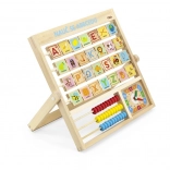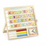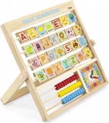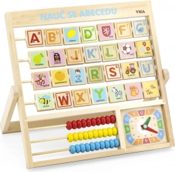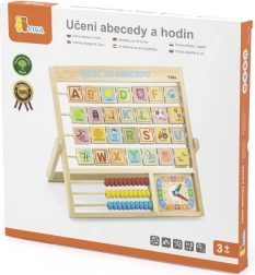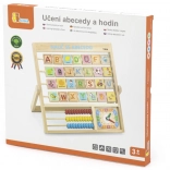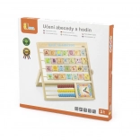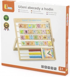 Lesena abeceda in ura v češkem jeziku. Otroci se lahko naučijo črk, števil in dobijo splošno predstavo o uri. Vsaka črka ima na drugi strani besedo za lažje pomnjenje. Dimenzije približno 32,5 x 32 x 2,3 cm. Dimenzije pakiranja približno 34 x 32,5 x 3 cm. Starost 3+.