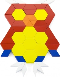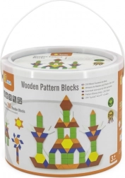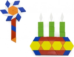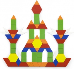 Veliko število ploščatih lesenih kock v različnih oblikah in barvah spodbuja domišljijo in razvoj prostorske predstave. Otroci lahko sestavljajo vzorce, živalice in celotne slike.