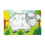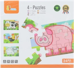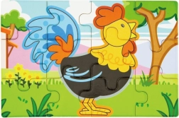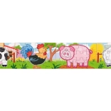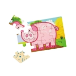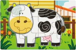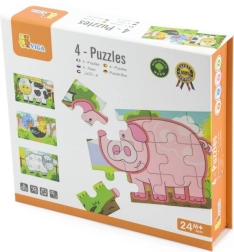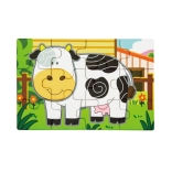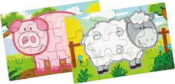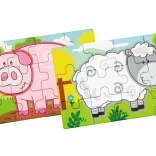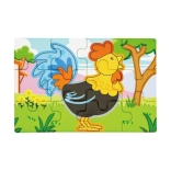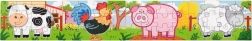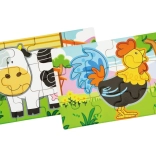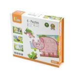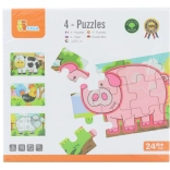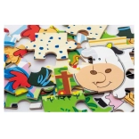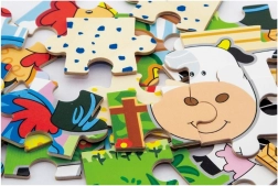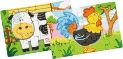Lesena sestavljanka z motivi kmetije. Pakiranje vsebuje skupaj 4 slike (skupaj 48 kosov). Iz sestavljank je mogoče sestaviti eno dolgo sliko vseh 4 živali. Dimenzije pakiranja približno 20,5 x 19,5 x 4,5 cm. Starost 24m+