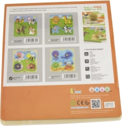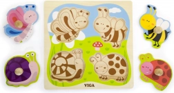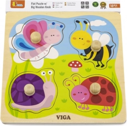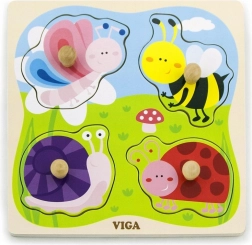 Lesena vstavljanka VIGA s 4 velikimi koščki z ročaji je idealna prva sestavljanka za najmlajše. Barviti motivi žuželk in živalic iz sveta travnika otroke naravno spodbujajo k raziskovanju in učenju. Izfrežani robovi na trdni leseni podlagi pomagajo, da vsak košček zanesljivo ostane na svojem mestu.