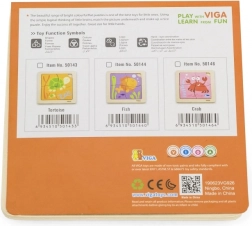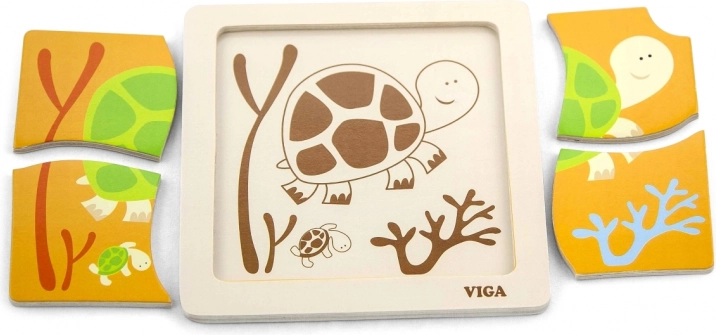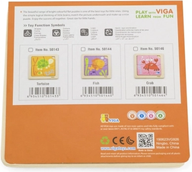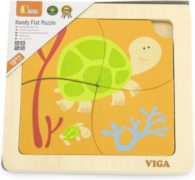 Lesena sestavljanka z želvico je zasnovana za otroke od 18 mesecev. Sestavljena je iz štirih velikih koščkov, ki jih je mogoče zlahka vstaviti v lesen okvir ali sestavljati samostojno. Vsak košček je barvito razgiban in ponuja edinstven način za razvoj otrokove prostorske domišljije in koordinacije oko–roka.