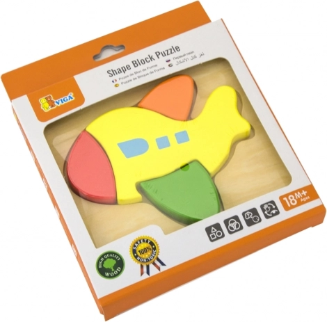 Lesene sestavljanke Viga Letalo so odlična izbira za prve poskuse sestavljanja doma ali v vrtcu. Zahvaljujoč štirim barvitim, robustnim koščkom si otroci hitro osvojijo princip ujemanja oblik v ustrezne izreze. Kakovostna izdelava, gladki robovi in nestrupene barve zagotavljajo varno igro.
