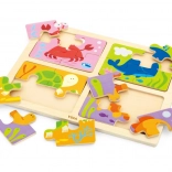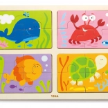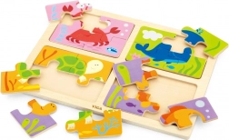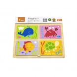Ta set vsebuje štiri preproste lesene sestavljanke s simpatičnimi motivi morskih živali. Zaradi manjšega števila koščkov so idealne za prvo spoznavanje otrok s sestavljanjem, razvijajo koordinacijo oko–roka in učijo potrpežljivosti.