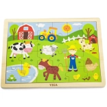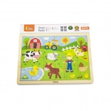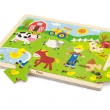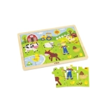 Lesene puzzle s kmetijskim motivom prikazujejo različne vidike kmečkega življenja, vključno z živalmi in kmetom, kar je privlačno za otroke.