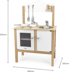 Lesena otroška kuhinjica znamke Viga je idealna za male kuharje, ki želijo posnemati kuhanje. Ta lesena konstrukcija z modernim belim in naravnim lesenim videzom je hkrati trpežna in elegantna, zato se poda v vsak otroški prostor.