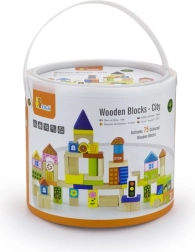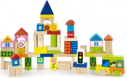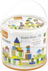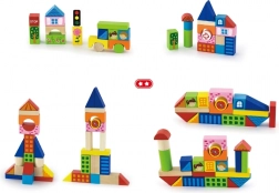 Lesene gradbene kocke v slogu mesta za otroke od dveh let so idealne za razvoj kreativnosti in motoričnih spretnosti. Komplet ponuja 75 pisano obarvanih kock, ki jih lahko kombinirate v različne oblike in strukture.