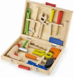 Ta kakovosten leseni komplet orodja znamke VIGA otrokom prinaša realističen občutek dela z orodjem. Barvni in trpežni kosi, kot so vrtalnik, kladivo, izvijač, ključ in žagica, spodbujajo domišljijo ter ponujajo varen način za razvoj spretnosti in koordinacije oko–roka.