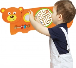 Senzorična tabla Medvedek je zasnovana po načelih Montessori, da otroke naravno motivira k raziskovanju in urjenju veščin. Ponuja več vrst aktivnosti: vrtenje zobnikov, vodenje kroglice v labirintu, opazovanje v varnem ogledalcu in vadbo prijema z vijaki na navoju. Zaradi robustne lesene konstrukcije in možnosti stenske namestitve je odlična za otroške sobe, igralnice in vrtce.